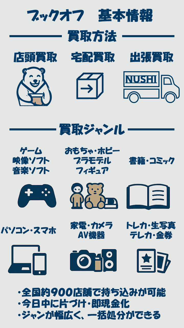 ここでは、ブックオフの基本情報や買取方法、買取ジャンルなどをわかりやすく解説していきます。