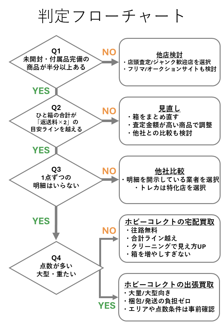 この記事ではホビーコレクトの評判と買取価格や手数料の実態、向く人/向かない人を解説しています。さらに、利用するか迷ったときに役立つフローチャートや、返送料で損をしないための損益分岐点セルフチェックも用意しています。